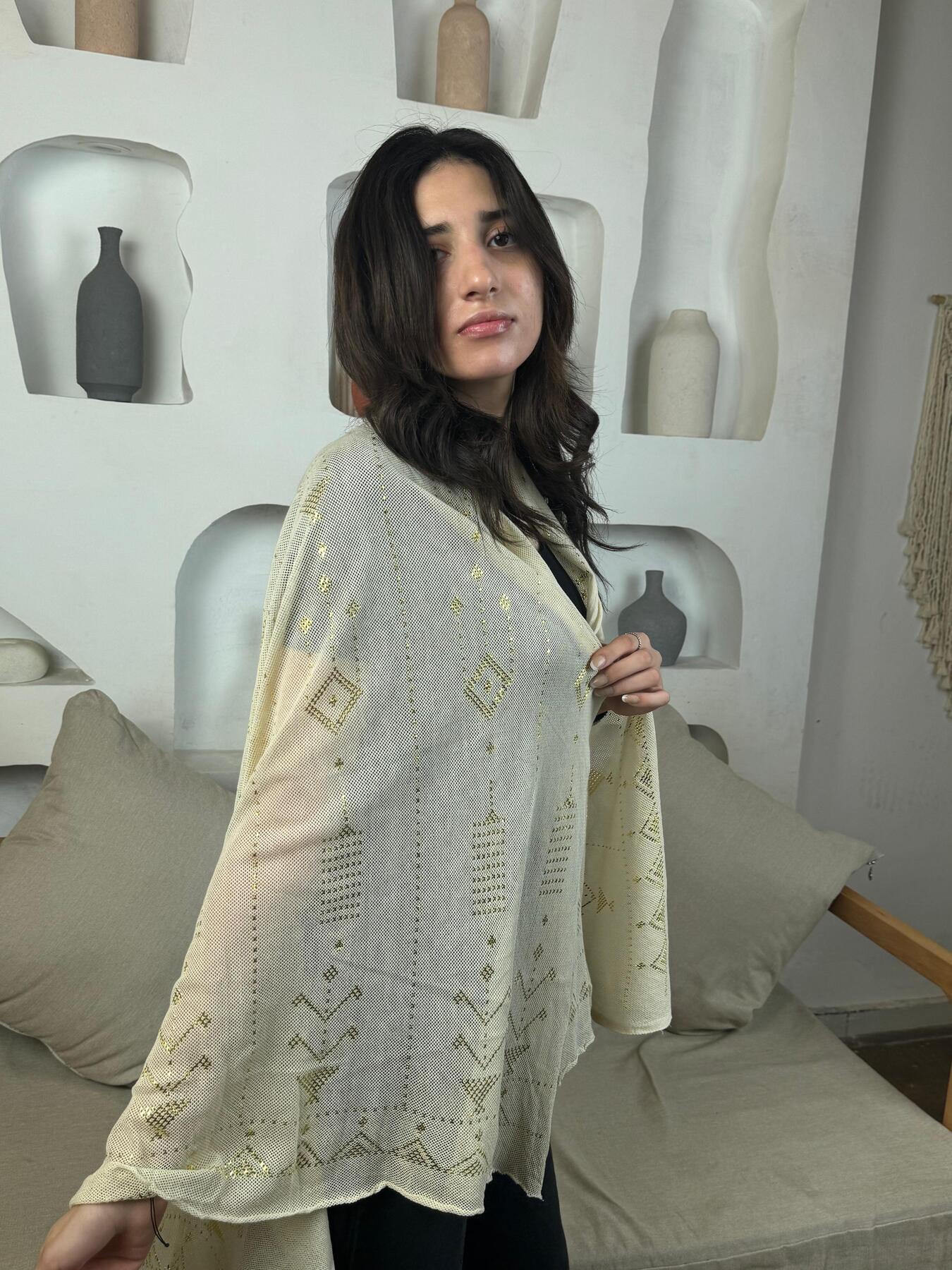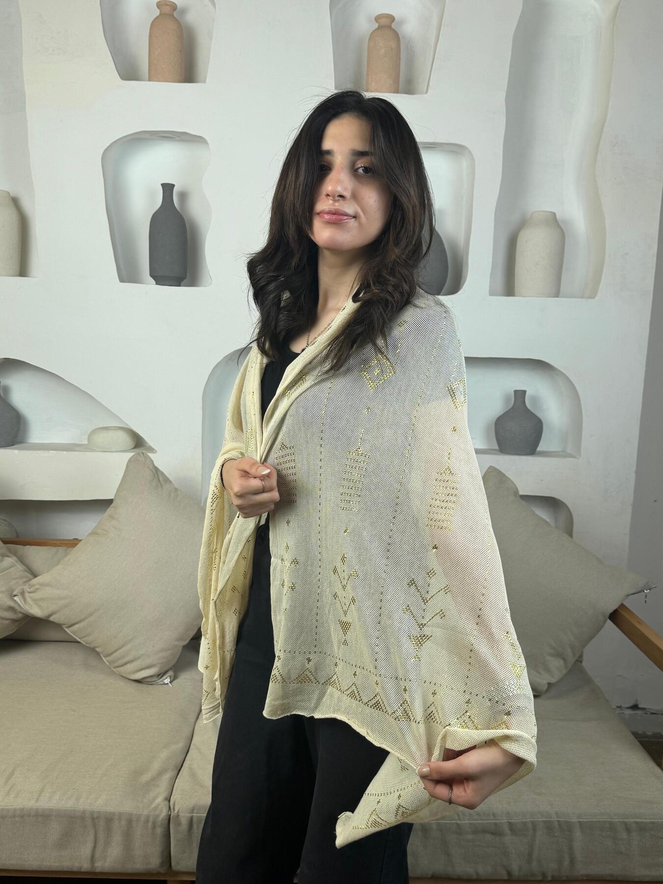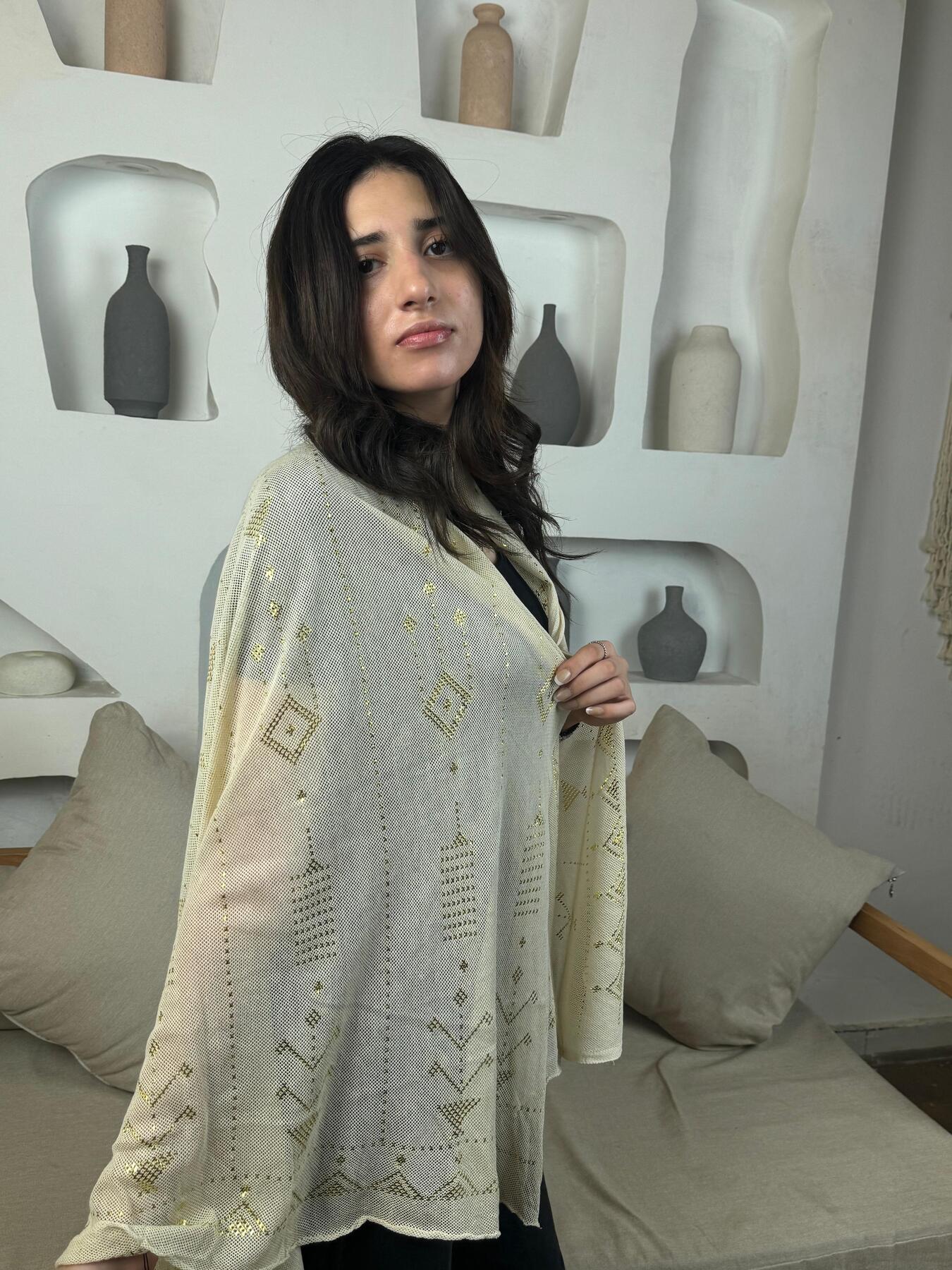 A timeless expression of Upper Egyptian craftsmanship, this beige tally shawl is exquisitely hand-embroidered with Gold-plated threads by the skilled women of Sohag. This centuries-old art form, known as “Tally” embroidery, blends heritage with elegance, creating a luxurious yet deeply cultural statement piece.