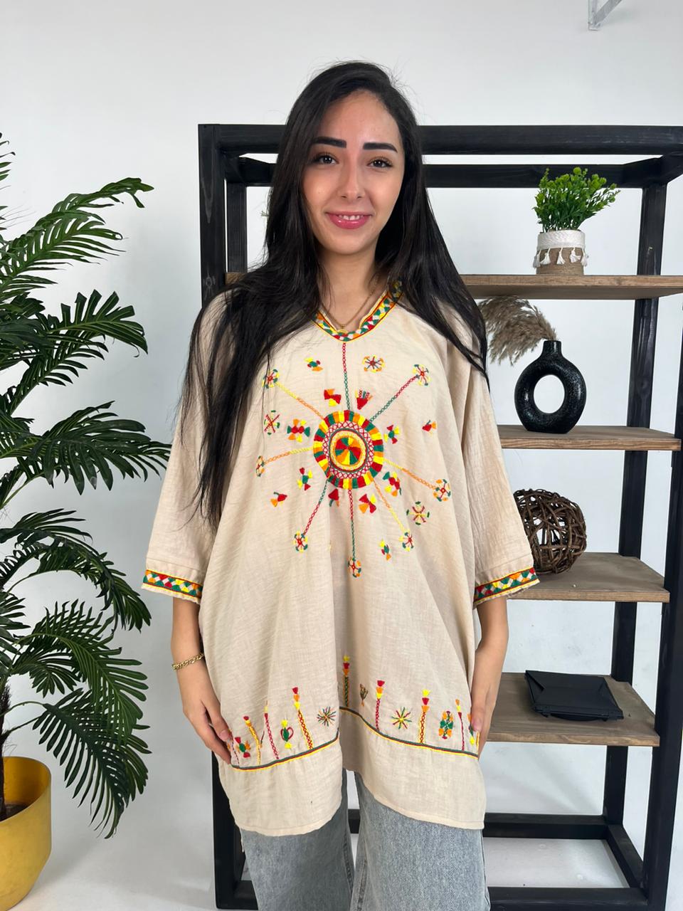 modern comfort with authentic Siwan artistry. Made from a premium cotton-linen blend, the blouse is lightweight, breathable, and perfect for everyday wear or special occasions.