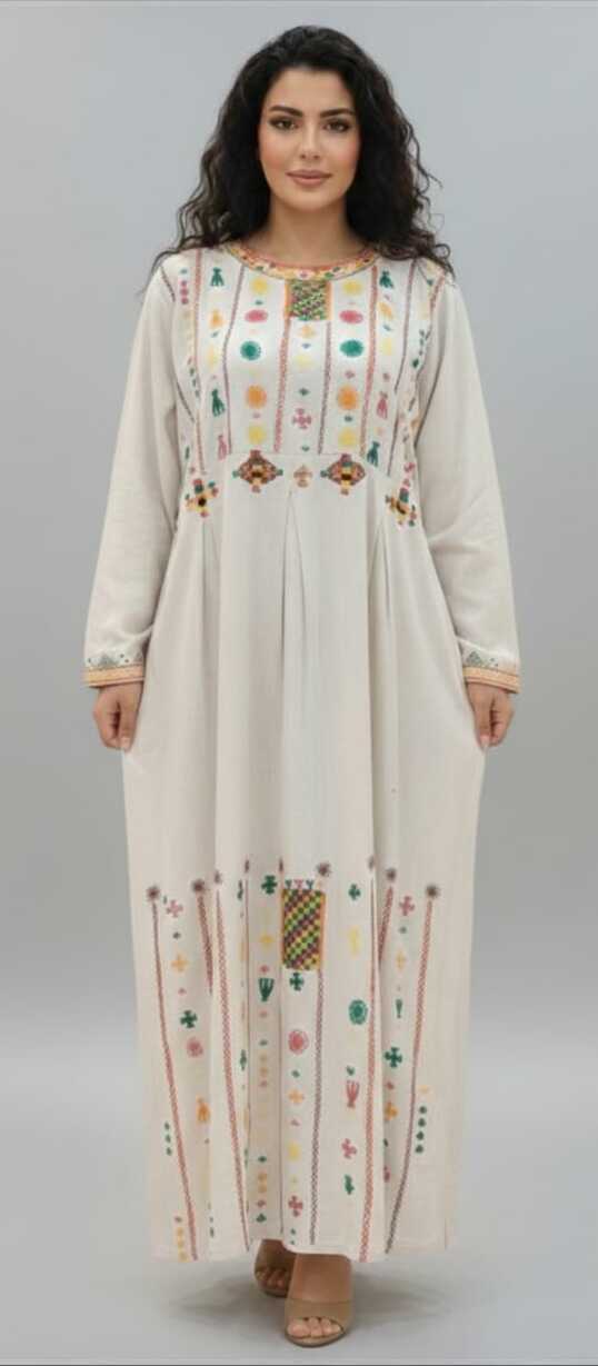 Hand-embroidered by talented women artisans from Siwa, this dress showcases intricate patterns inspired by the desert landscape. The designs reflect elements of nature and traditional Siwan culture, bringing authenticity and artistic beauty to every detail.