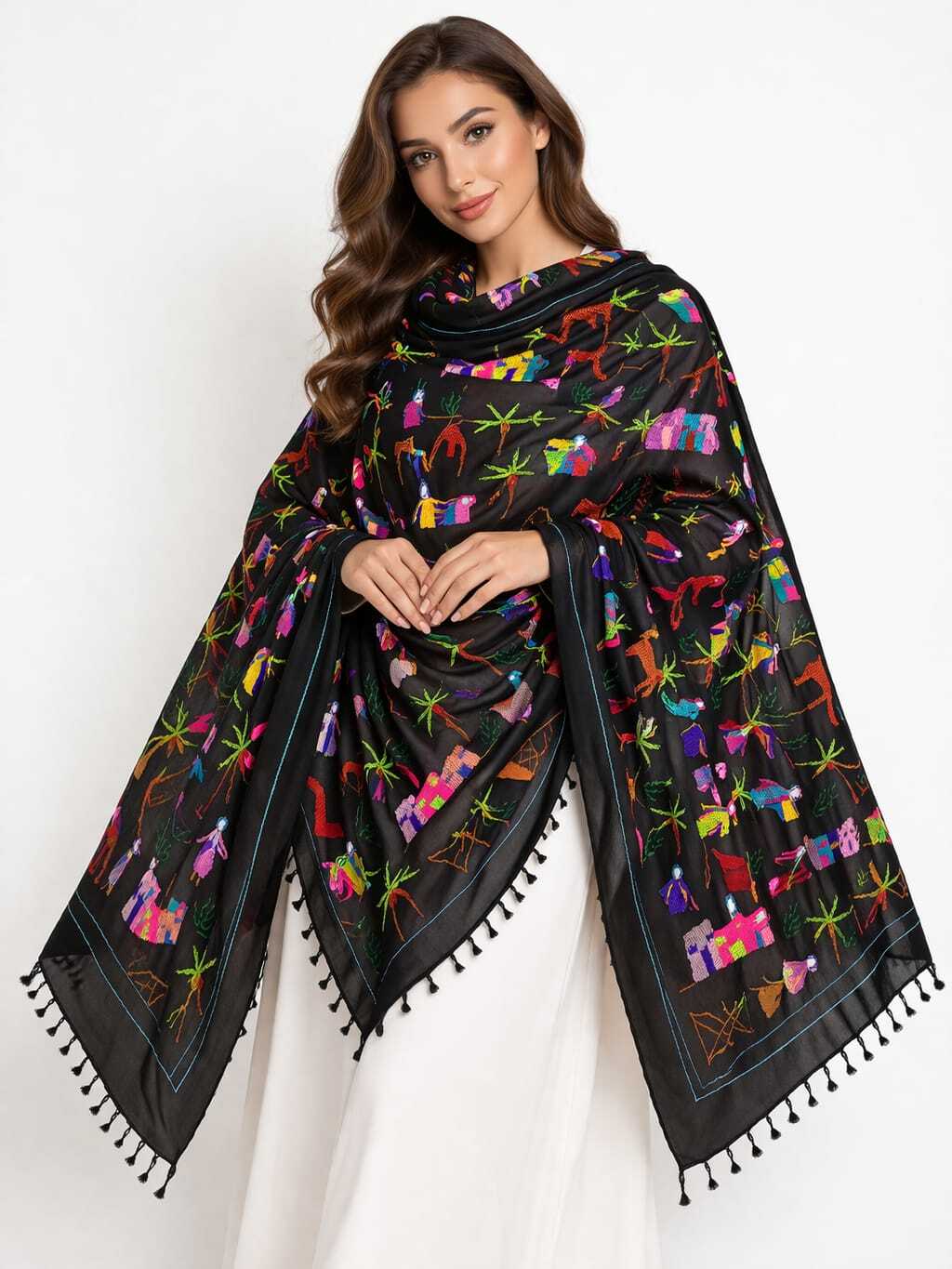 What truly makes this piece special is its detailed hand embroidery. The designs are inspired by the beauty of Egyptian village life—capturing scenes of nature, palm trees, simple homes, and cultural elements that reflect authenticity and warmth. Each stitch tells a story, making every scarf a wearable piece of art.