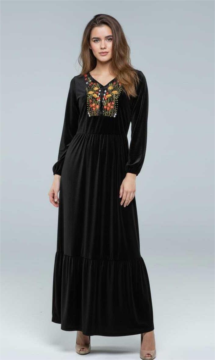 Elegant black velvet dress, beautifully hand-embroidered by talented Egyptian women. A unique, one-of-a-kind piece that blends tradition with modern style.