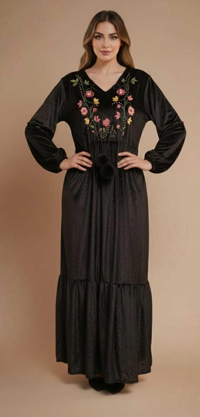 This stunning black velvet dress is a true expression of Egyptian artistry. Carefully handcrafted and hand-embroidered by skilled Egyptian women, it features intricate patterns and motifs that reflect creativity, heritage, and cultural beauty.