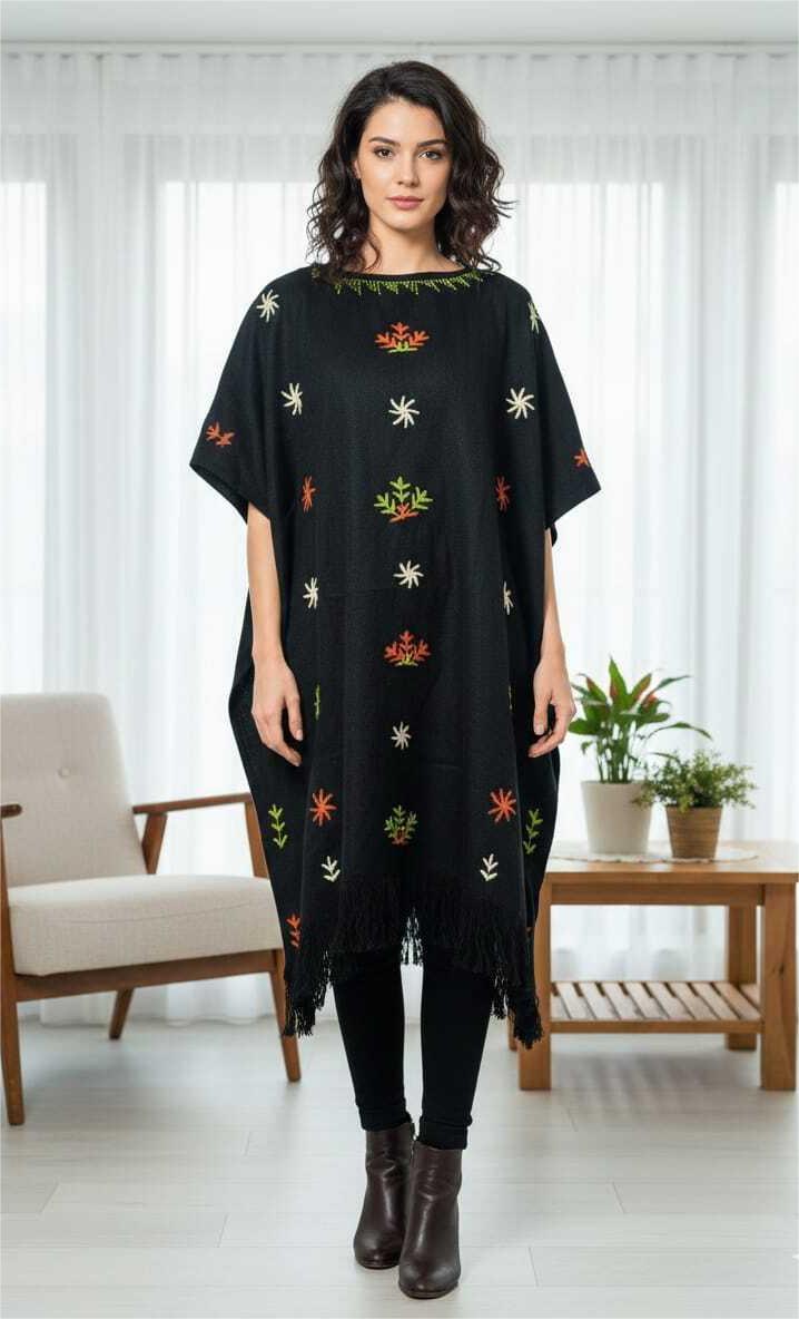 Hand-embroidered by skilled women artisans from Saint Catherine, this piece features intricate patterns inspired by the surrounding natural landscapes and traditional cultural elements. Each stitch reflects generations of craftsmanship, creativity, and heritage—making every poncho truly one of a kind.