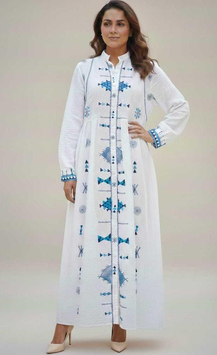 Hand-embroidered by talented women artisans from Siwa, the dress features intricate patterns inspired by the desert landscape—capturing the essence of nature, culture, and traditional Siwan artistry. Each stitch is crafted with care, making every piece truly unique and full of character.