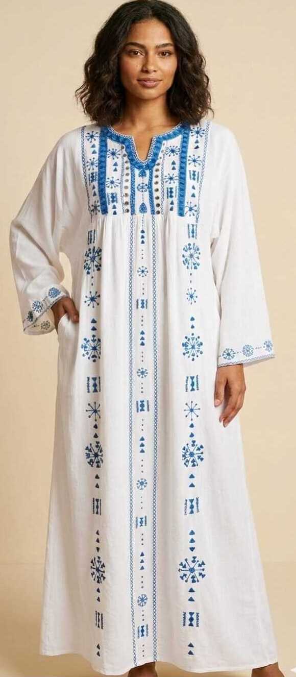 Hand-embroidered by talented women artisans from Siwa, this dress showcases intricate patterns inspired by the desert landscape. The designs reflect elements of nature and traditional Siwan culture, bringing authenticity and artistic beauty to every detail.