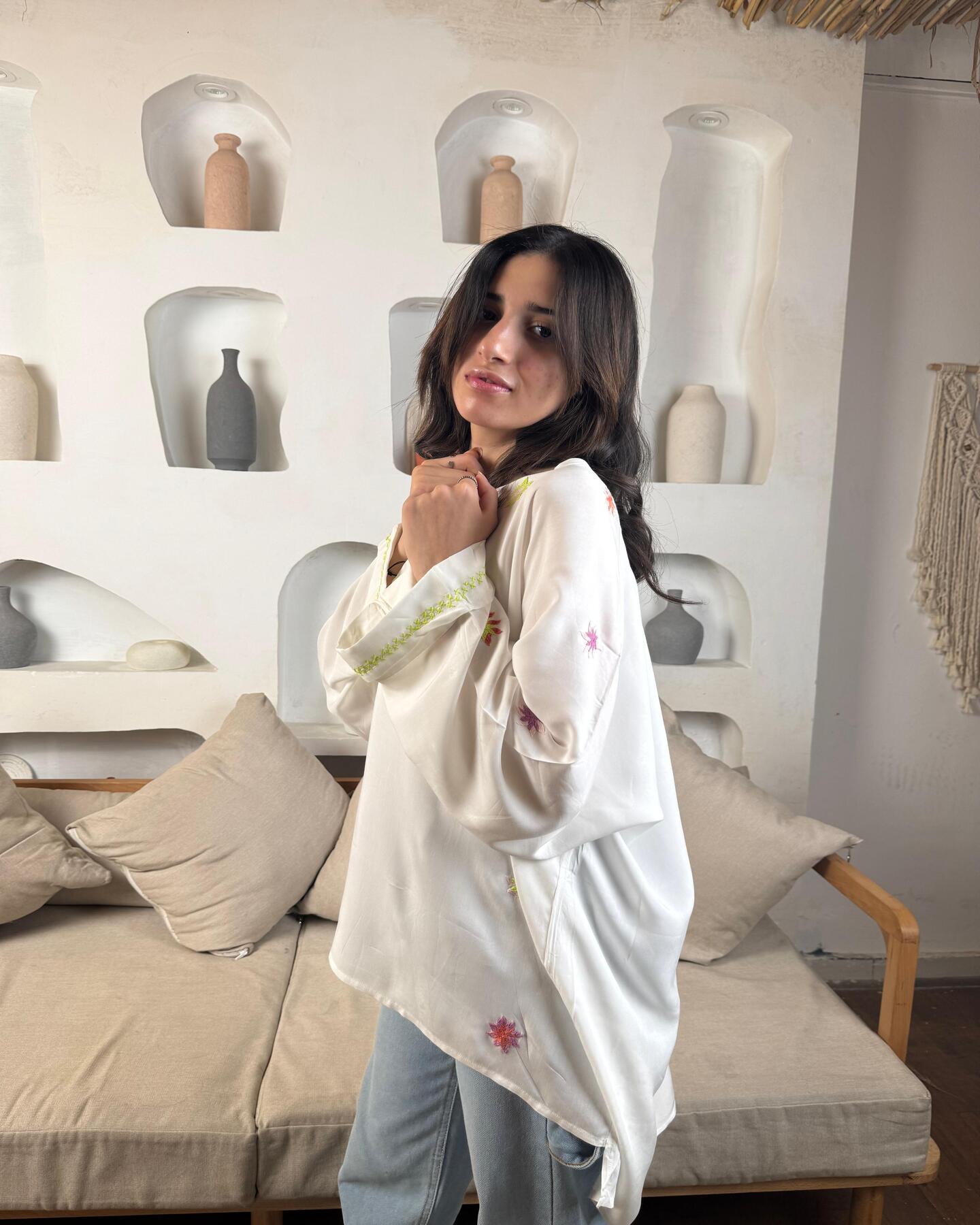 The soft, breathable cotton fabric provides comfort and elegance, while the flowing free-size design ensures a flattering fit for sizes up to 3XL. The embroidery showcases rich cultural symbols drawn from desert life, native flora, and Bedouin storytelling — making each poncho a unique statement of identity and craftsmanship.
