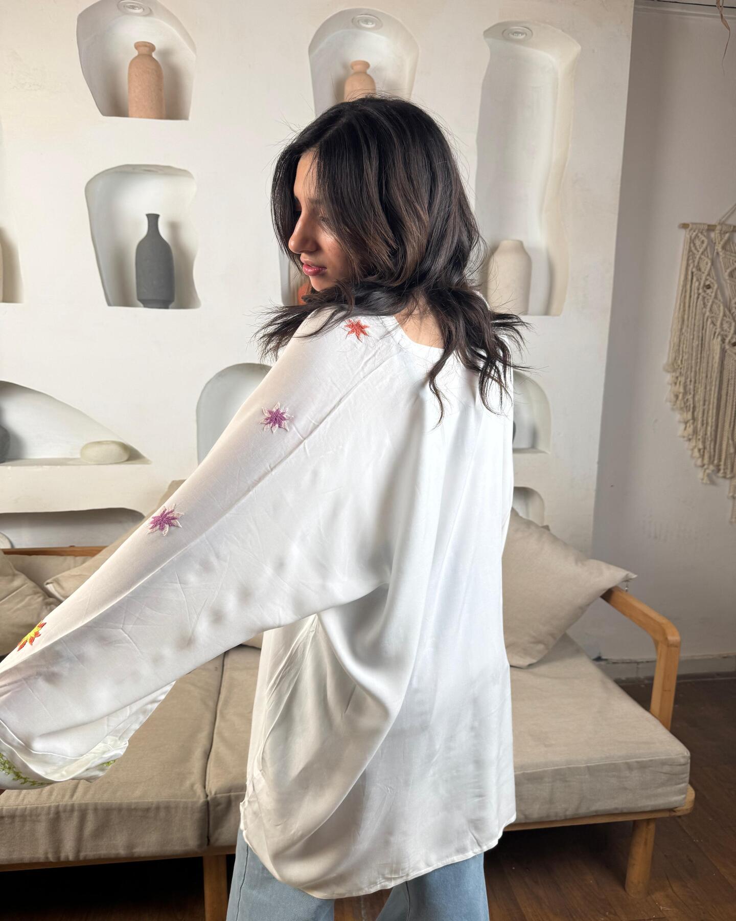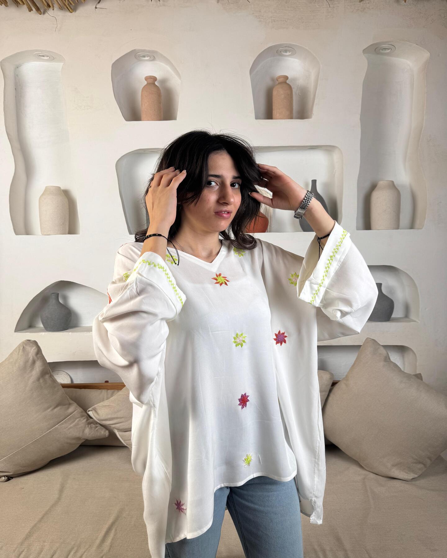 This White cotton blouse is more than a garment — it’s a piece of heritage lovingly crafted by the women artisans of St. Catherine, Sinai. Each blouse is hand-embroidered with care, featuring vibrant motifs and traditional Bedouin-inspired patterns passed down through generations.